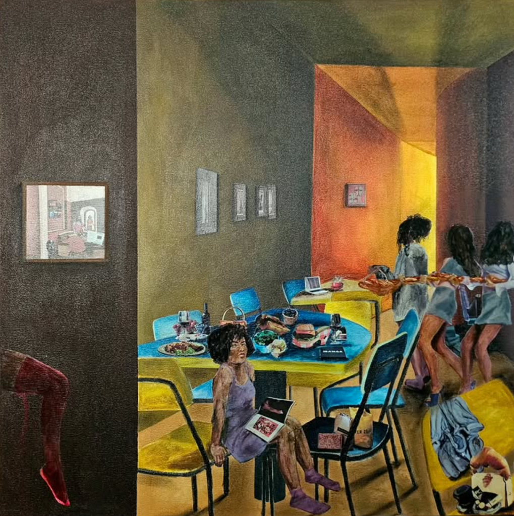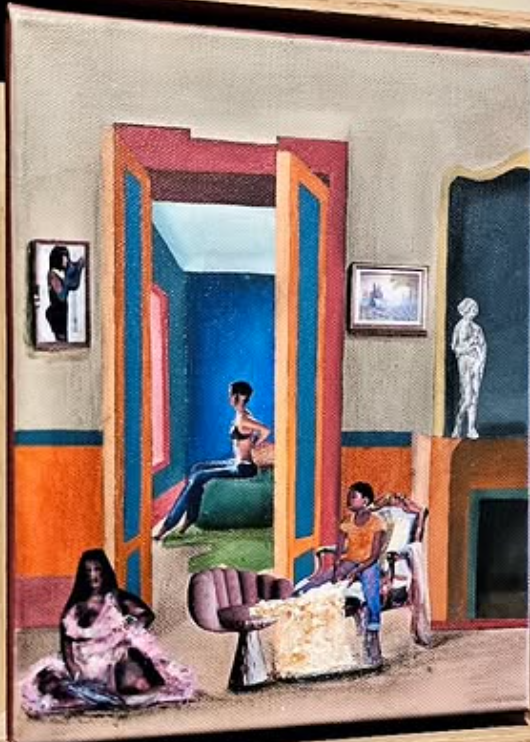 Through her practice, Mulanga juxtaposes several different women in her paintings, thereby highlighting the complexities of female identity, the stream of varying consciousnesses that occupy a single space, identity or moment in time. Representing female bodies within a variety of architectural spaces and contexts, her work operates as multi-perspectival portraits while the spaces allow her to create open conversations and interrogate the notions of beauty. This polyphonic character is amplified through the introduction of additional female subjects via the inclusion of painted or collaged artworks hanging on the walls of the rooms occupied by my subjects.